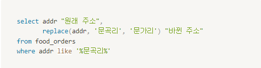 - replace(변경 할 컬럼, 현재 값, 바꿀 값)